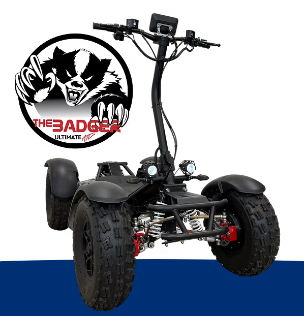The Badger is an all-wheel-drive off-road electric scooter/ATV engineered for steep grades and rough terrain. VCarts highlights up to a 45° incline capability and a 50 Ah battery option, with bolt-on accessories (golf bag carrier, rear basket, trailer hitch, gun rack) to switch between work and play. Video demos show hill-climb and durability tests.