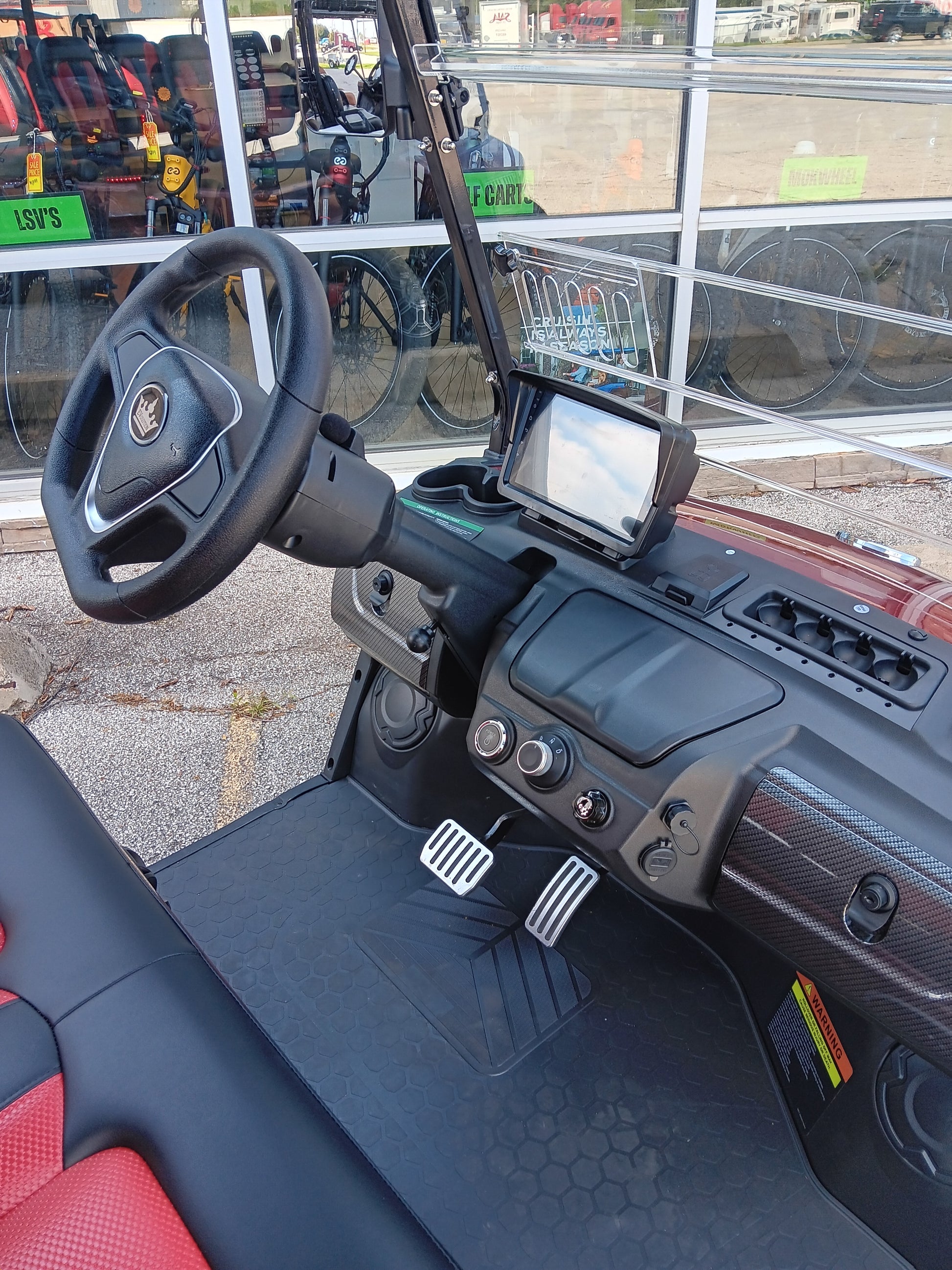Up front, a 9-inch touchscreen with Apple CarPlay® & Android Auto™ support lets you queue road-trip playlists, check the back-up camera, and track speed at a glance. Plush two-tone seats, LED light bar, and a surround soundbar turn every run into a mini-adventure. Street legal on any Iowa road—no matter local regulations.