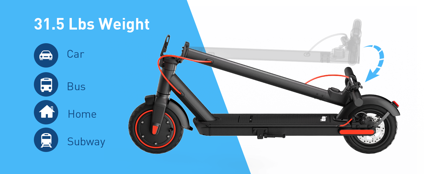The Hiboy S2R Plus features 9" pneumatic tires, which offer a smoother ride while maintaining a lightweight a portable carry weight of 32 lbs. The removable battery gives peace of mind; like why would anyone steal a scooter that doesn't have it's battery...duh.