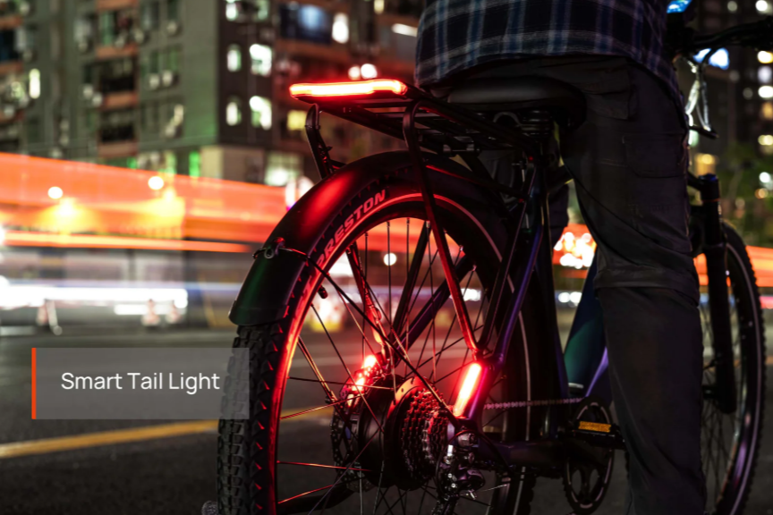 Integrated turn signals and built-in brake light design, which automatically illuminates and cuts off motor power when raking, enhancing riding safety, Ensures better visibility day or night, improving road safety.